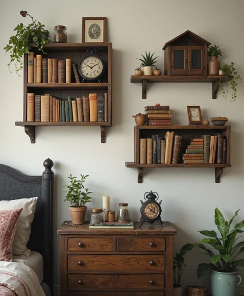 Wall-mounted antique shelves are perfect for displaying books, trinkets, and vintage decor. I find that they add both personality and practicality to a bedroom. You can mix old books, small plants, or vintage clocks to enhance the bohemian vibe while keeping your essentials organized.