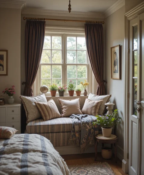 A cozy window nook is my personal favorite corner in a bedroom. Add soft cushions, a throw, and small potted plants to make it feel like your private retreat. It’s perfect for reading, relaxing, or enjoying a peaceful morning while staying true to the vintage aesthetic.