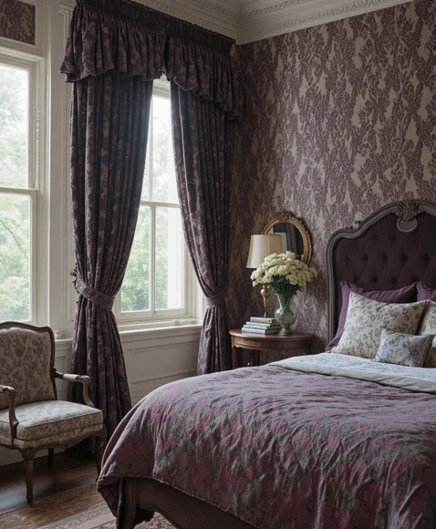 Patterned curtains in rich textures instantly elevate a bedroom. I recommend velvet or brocade curtains in jewel tones for a Victorian feel. They add warmth, privacy, and a touch of opulence, making your room feel both cozy and grand.