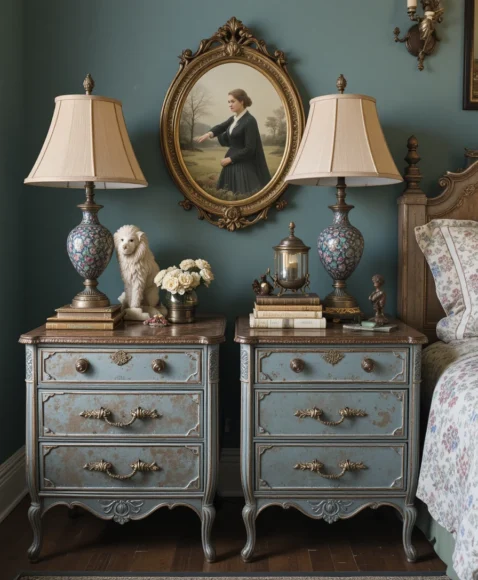 Vintage nightstands with small drawers and intricate detailing are functional and decorative. I love adding antique lamps, books, and small trinkets on top to create a lived-in, cozy look. These nightstands help balance the room while staying true to the aesthetic.