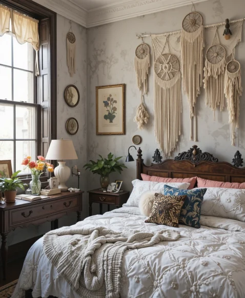 Bohemian hanging decor, like macramé or dreamcatchers, adds a relaxed, artistic touch. I enjoy hanging them above the bed or near windows to bring texture and movement into the room. It softens the Victorian structure and introduces a playful, eclectic vibe.