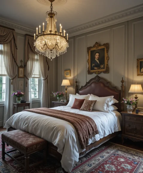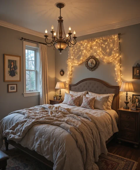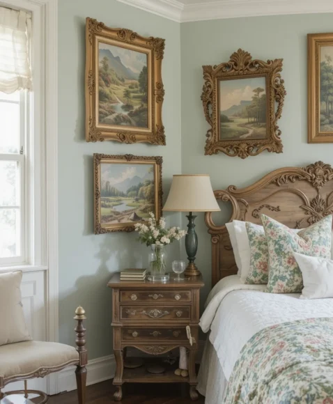 Hanging vintage artwork in ornate frames completes the room. I prefer landscapes, portraits, or botanical prints that match the color scheme. They add personality, depth, and a sense of history, making the bedroom feel lived-in and cozy while embracing Victorian and bohemian aesthetics.