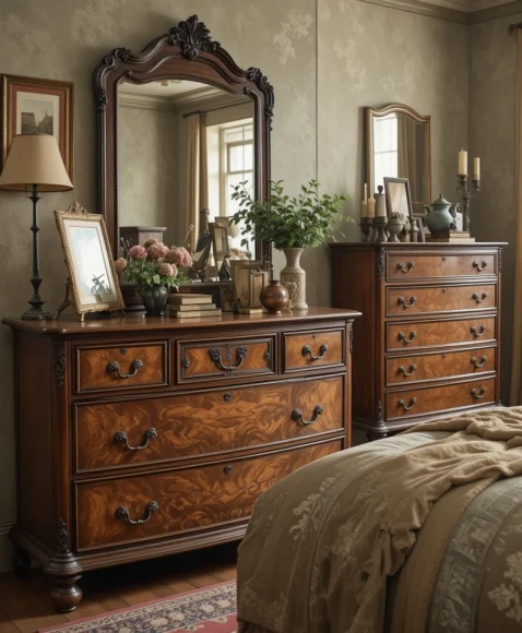 Antique wooden dressers with ornate handles add a nostalgic touch to your vintage bedroom. I recommend picking warm-toned wood for that authentic Victorian feel. These dressers are not just functional but also a great statement piece. Pair them with small decorative items like candle holders or antique mirrors to complete the look.