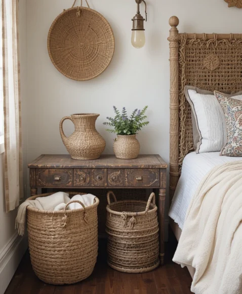 Woven baskets combine utility and aesthetic perfectly. I use them for blankets, pillows, or magazines. Their natural textures complement the bohemian and vintage elements, keeping the room organized while adding warmth and softness.