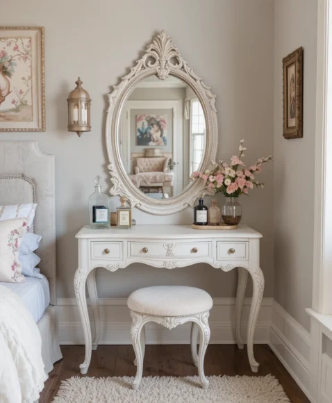 Creating a vintage vanity corner adds both functionality and charm. Opt for an ornate mirror, a delicate stool, and antique perfume bottles to make the corner feel magical. I love spending time here in my space because it’s both practical and aesthetically pleasing, making daily routines feel luxurious.