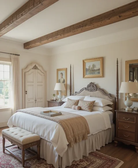 Exposed wooden beams bring rustic warmth to a vintage bedroom. I love the way they naturally add character and make the room feel grounded. Pair the beams with soft, neutral walls and antique furniture to balance the rustic and elegant vibes perfectly.