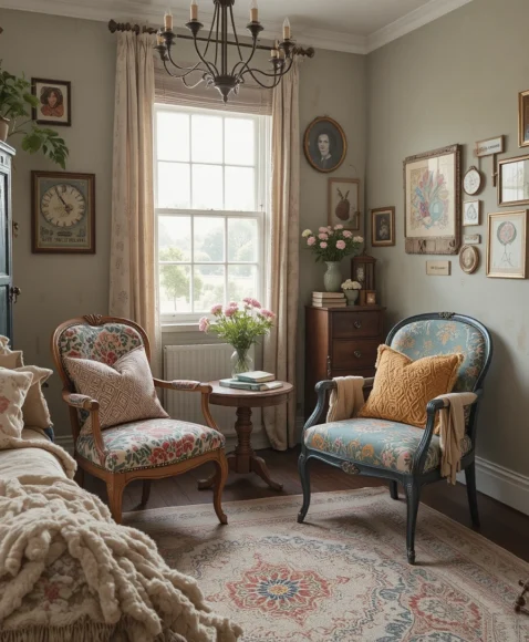 Adding mismatched vintage chairs gives your room a whimsical bohemian touch. Choose chairs with different patterns or finishes and pair them with cozy cushions. I like how this approach makes the room feel curated rather than staged, creating an inviting spot to sit and read.