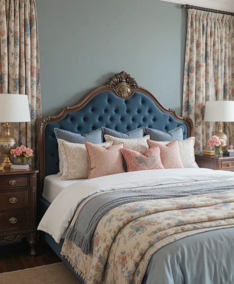 A statement headboard in tufted velvet or carved wood instantly elevates a bedroom. I personally prefer bold yet elegant designs that act as the centerpiece of the room. It ties together the bedding, curtains, and decor for a cohesive Victorian-Bohemian vibe.