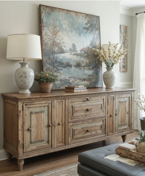 Furniture with a slightly worn or distressed finish adds authenticity. I chose a distressed sideboard, and it gave the space character while harmonizing with modern accents.