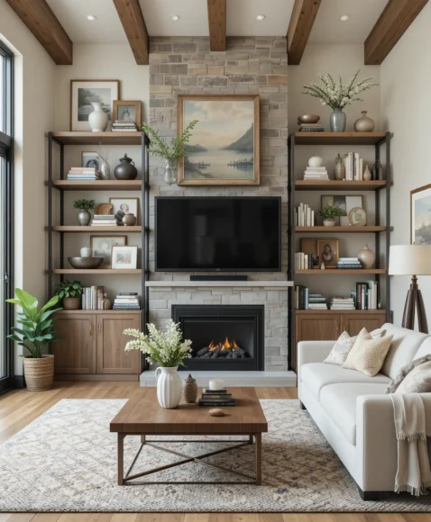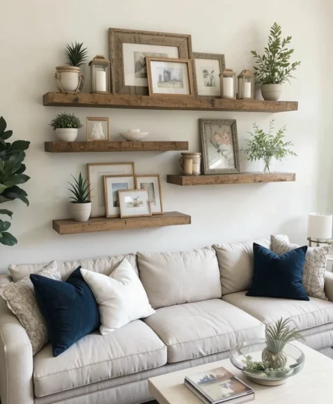 Floating wooden shelves are a practical and stylish way to display decor. I arranged rustic frames, candles, and small potted plants, and the shelves brought vertical interest and personality to my living room.