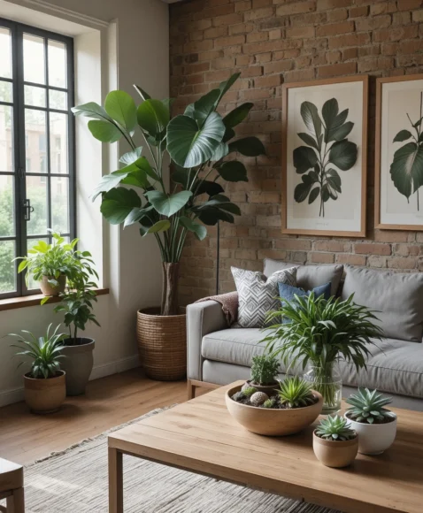 Adding greenery softens the rustic look and adds life to the room. I placed a large fiddle leaf fig in the corner and smaller succulents on my coffee table, creating a natural, relaxing vibe that enhances the cozy atmosphere.