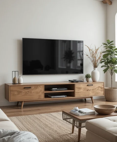 A sleek wooden TV unit combines functionality with rustic appeal. I picked a simple oak unit, which complements the natural textures in the room without looking bulky or outdated.