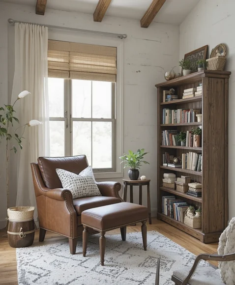 Creating a corner with your favorite chair, a small table, and personal items adds a unique touch. I set up a reading nook with a leather armchair and a small rustic bookshelf, making the space cozy, personal, and inviting.