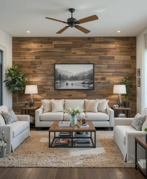 A reclaimed wood accent wall instantly brings warmth and character to your living room. I added a distressed oak wall behind my sofa, and it became the centerpiece of the room. This idea works perfectly with neutral furniture and modern lighting, creating a rustic yet refined atmosphere that feels cozy and inviting.