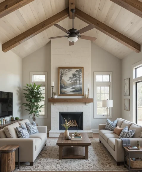 Using soft beige, gray, and off-white tones creates a serene backdrop for rustic furniture and wooden accents. I love how a neutral palette allows me to layer textures like wool rugs, leather sofas, and linen curtains without overwhelming the space. It’s simple, elegant, and comforting.