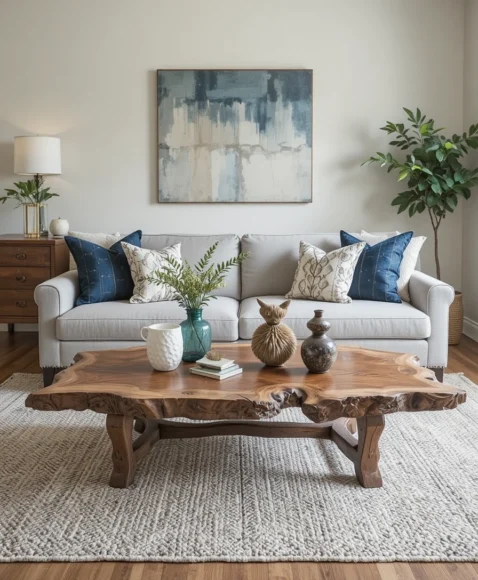 A handcrafted wooden coffee table with natural edges brings a warm, organic vibe to the room. I selected a live-edge table, and it became a conversation starter while anchoring my seating area beautifully.