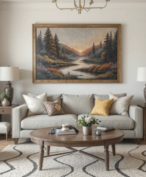 Wooden frames, metal sculptures, or nature-inspired paintings enhance the rustic vibe. I used a large framed landscape painting above my sofa, and it added a personal, cozy touch while maintaining a modern aesthetic.
