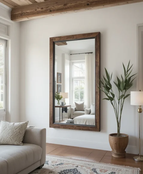 A large mirror with a wooden or metal frame opens up space and reflects light. I placed mine opposite the window, and it made the room feel brighter and more spacious while adding a decorative element.