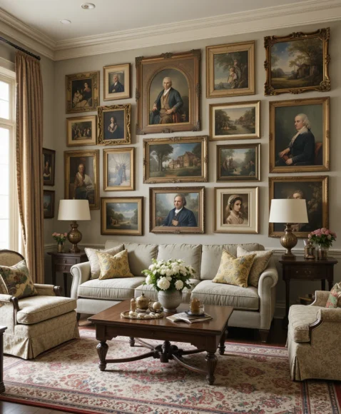 Incorporate antique paintings or framed prints into your living room walls. Use a gallery-style arrangement with modern art pieces to achieve a curated, eclectic look that reflects personal taste.