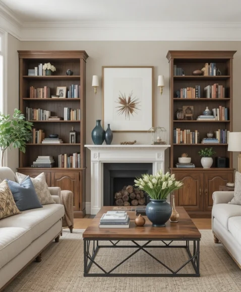 Showcase your books and collectibles on vintage wooden bookshelves. Pair them with sleek metal or glass décor pieces to maintain a balanced look. Mixing old and new elements creates a visually dynamic living room.