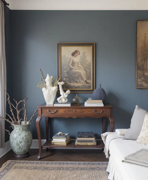 A console table from the early 20th century can add elegance behind a sofa or along a hallway wall. Accessorize with modern sculptures or a minimalist vase to merge eras effortlessly.