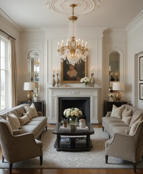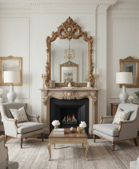 Large, gilded antique mirrors not only enhance your living room’s brightness but also create the illusion of more space. Place them above a fireplace or behind a sofa for a dramatic effect that merges elegance with modern sensibilities.