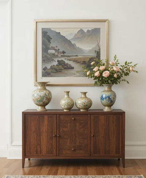 A vintage sideboard provides extra storage while acting as a decorative element. Pair it with contemporary artwork or mirrors to create a seamless mix of old-world charm and modern convenience.