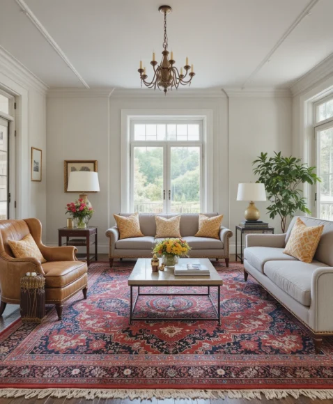 2. Vintage Rug Anchoring the Space