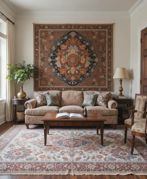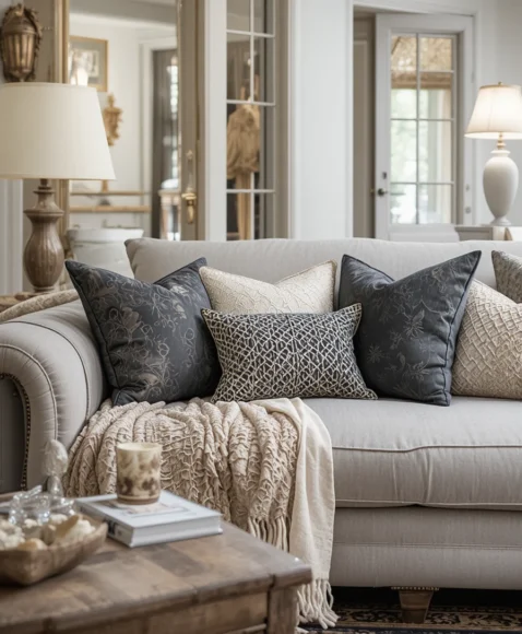 Add antique throws, cushions, and blankets to modern sofas. The blend of textures—silk, velvet, and linen—enhances the cozy factor while showcasing the charm of vintage textiles.