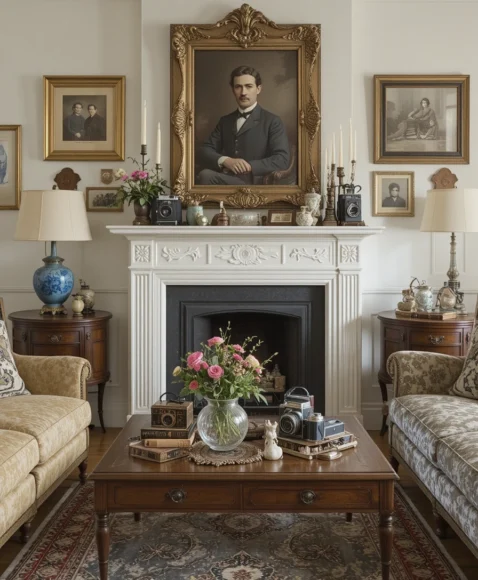Finally, incorporate personal heirlooms or vintage souvenirs into your living room décor. Items like old cameras, family portraits in antique frames, or antique figurines give your space a personalized, lived-in feel that modern furniture alone can’t provide.