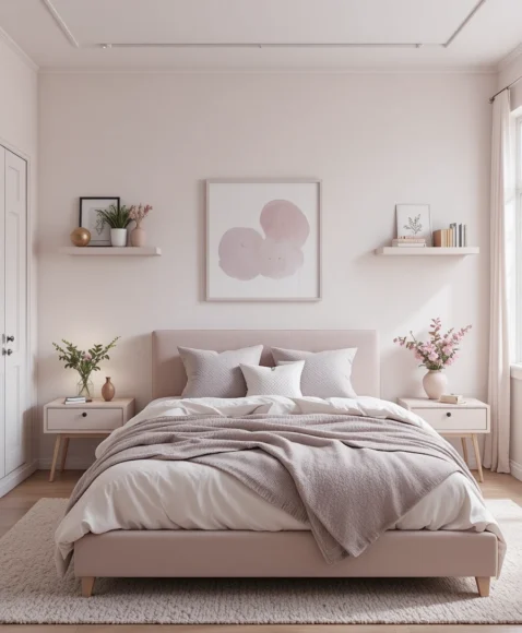 A minimalist bedroom in soft pastel shades like blush pink, lavender, or mint can make your apartment feel airy and calm. Keep the furniture simple—a low-profile bed, sleek nightstands, and floating shelves—while using textured cushions and a cozy throw to add warmth. The gentle hues and minimal clutter instantly create a serene atmosphere perfect for relaxation.