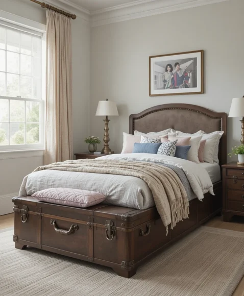 A bed with built-in storage or a vintage trunk at the foot combines style and practicality. Store seasonal clothing, extra blankets, or personal items while adding a charming vintage accent to your room. This idea is perfect for women in apartments, offering storage without compromising aesthetics.