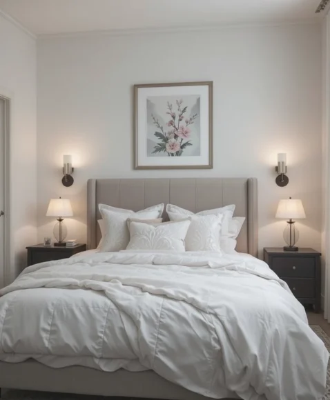 Focus on simple, elegant lighting for a minimalist bedroom. Use wall sconces or modern table lamps to create a warm, inviting ambiance. Avoid oversized fixtures that dominate the space—small, thoughtful lighting enhances comfort and style simultaneously.