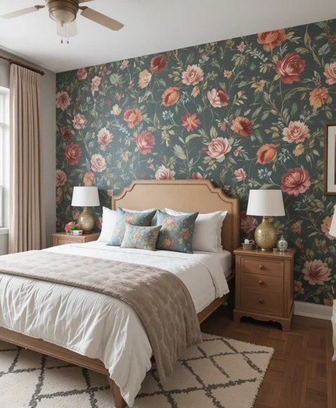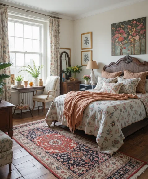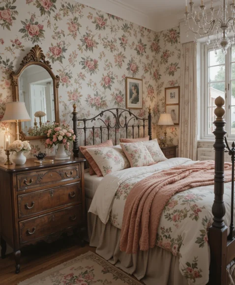 Embrace vintage floral patterns with wallpaper, bedding, or accent pillows. Pair it with antique furniture like a distressed wooden dresser or a wrought-iron bed frame to complete the nostalgic feel. Add delicate fairy lights or a vintage mirror to enhance the romantic, feminine vibe. This style is perfect for women who love elegance with a touch of history.