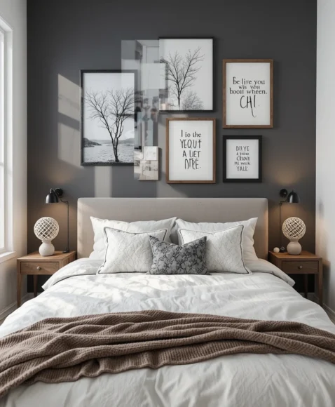 Create a photo wall with framed memories, prints, or postcards. This personal touch adds warmth and tells your story through decor. Mix modern and vintage frames for an eclectic yet cohesive look that makes your bedroom truly yours.