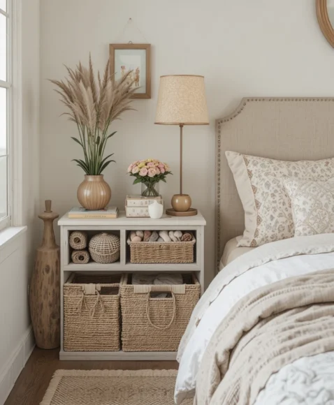Utilize stylish storage solutions like woven baskets, decorative boxes, or under-bed organizers. This approach keeps your bedroom tidy while adding a touch of charm. In apartments, smart storage is crucial to maintain a minimalist and comfortable space.