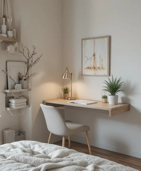 Add a compact desk or a wall-mounted workspace in a corner of your bedroom. Keep the decor clean and minimal, with only essentials like a lamp, notebook, and plant. This is perfect for women who need a functional yet stylish area for work or hobbies.