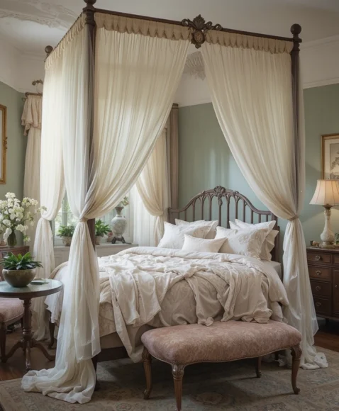 A canopy bed with sheer curtains adds a touch of vintage romance to your space. Use soft, flowing fabrics and pastel tones to maintain a light, airy feel. This idea combines elegance with comfort, making your bedroom a dreamy retreat.