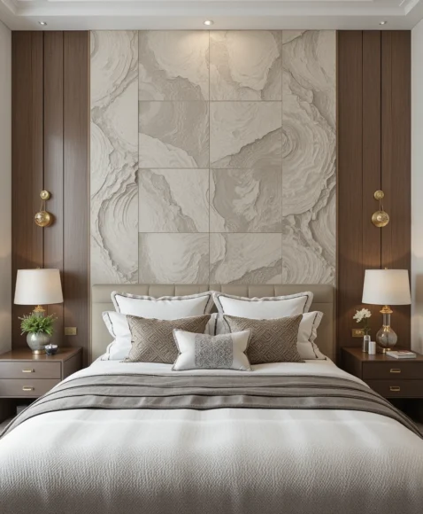 Add textured wall panels behind your bed to create a focal point. Materials like wood, fabric, or 3D tiles bring dimension and interest to minimalist bedrooms. Keep the rest of the decor simple to allow the panels to shine, balancing elegance and style effortlessly.