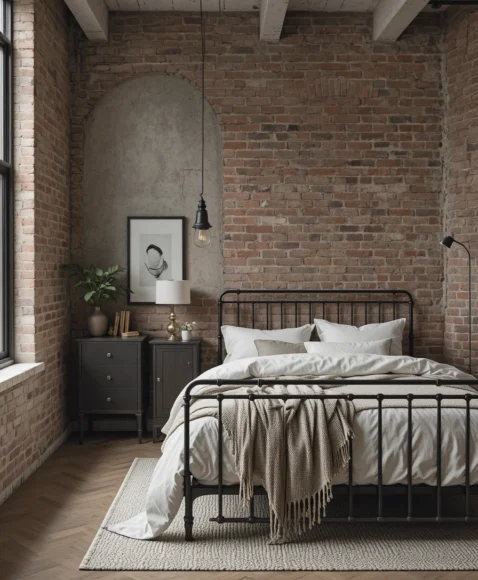 Transform your bedroom into a minimalist industrial space with exposed brick walls, metal furniture, and neutral tones. Use soft fabrics like linen or cotton for bedding to soften the raw edges. Add a vintage pendant light or a small indoor plant for a balanced look. This design works well for women who enjoy a modern, edgy aesthetic.