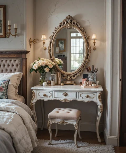 Dedicate a small corner to a vintage vanity table with an ornate mirror and classic stool. Add soft lighting and organize your beauty essentials neatly. This simple addition adds a luxurious touch to your bedroom while staying functional, giving a personal feel that every woman will love.