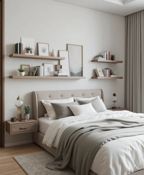 For apartments with limited space, floating shelves are both practical and stylish. Use them to display books, small plants, or decorative items. Pair them with a sleek bed and neutral color palette to maintain a clean, airy feel. Floating shelves give you room to personalize your space without cluttering the floor.