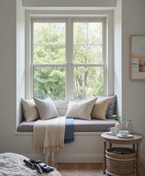 Transform a window corner into a cozy reading nook with a soft cushion, throw blankets, and a few decorative pillows. Add a small side table for books or a cup of tea. This not only enhances your apartment bedroom’s functionality but also provides a serene spot for relaxation or self-reflection.