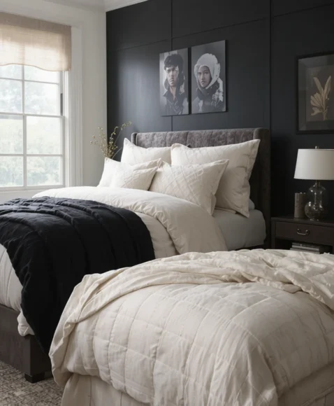 A single black accent wall instantly grounds the room while keeping the rest of the space light with cream bedding. I like how this contrast adds depth without feeling heavy. Layering soft cream quilts and throws keeps everything warm and inviting. The mix creates a naturally balanced backdrop you can style in many ways.
