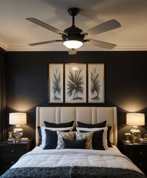 A black fan base with cream blades creates a sleek decor moment. I love how it draws the eye upward and adds subtle contrast. Choosing warm-toned lighting keeps the bedroom cozy at night. It’s a smart choice for function and style together.
