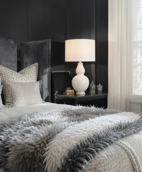 A simple cream throw draped over a black bed frame adds softness and instant warmth. I like how it breaks up the dark furniture and makes the bed feel cozier. Choosing chunky knits or faux fur gives more texture. It’s a small change with a big visual payoff.