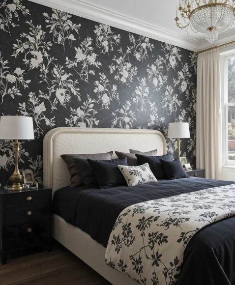 Black wallpaper featuring cream geometric or floral prints adds drama and elegance. I love how it turns a plain wall into a statement moment. This mix feels stylish without being overwhelming. It’s perfect for a feature wall behind the bed.