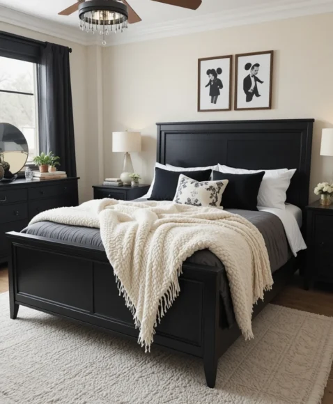Black dressers or nightstands look cleaner and more polished when paired with cream pillows, sheets, or curtains. The mix feels structured but still warm. Adding woven throws or linen textures in cream creates a cozy vibe. I like this idea for creating balance without needing to repaint the walls.