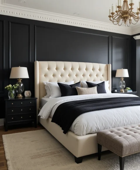 A plush cream tufted headboard looks luxurious when placed against matte black walls. This pairing softens the boldness of the wall and adds a hotel-like feel. I love how the tufting adds dimension, making the bedroom feel cozy and upscale at once. It’s a great way to bring softness into a moody color scheme.