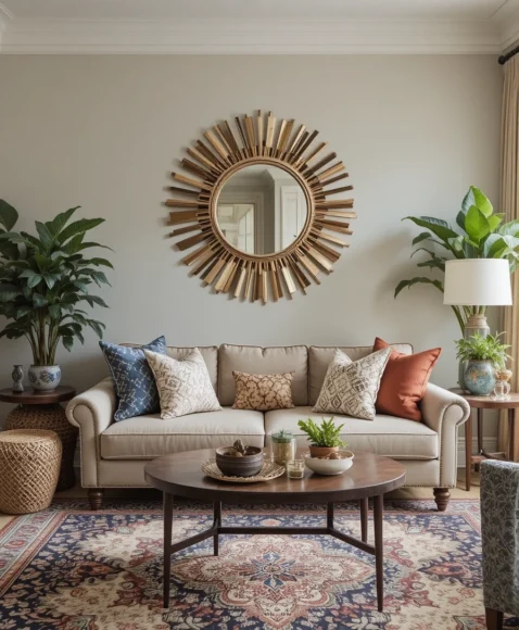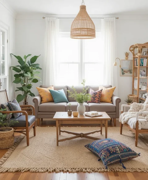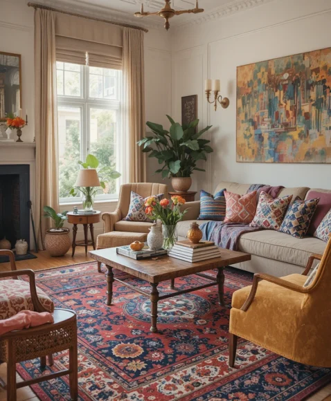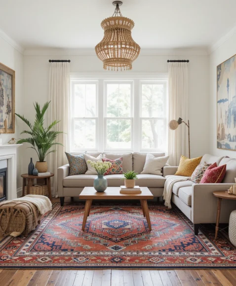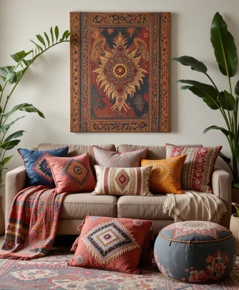 Use neutral tones for background elements and bold, vibrant patterns for accent pieces like pillows, rugs, and throws. This creates a balanced, eclectic look that’s full of personality.